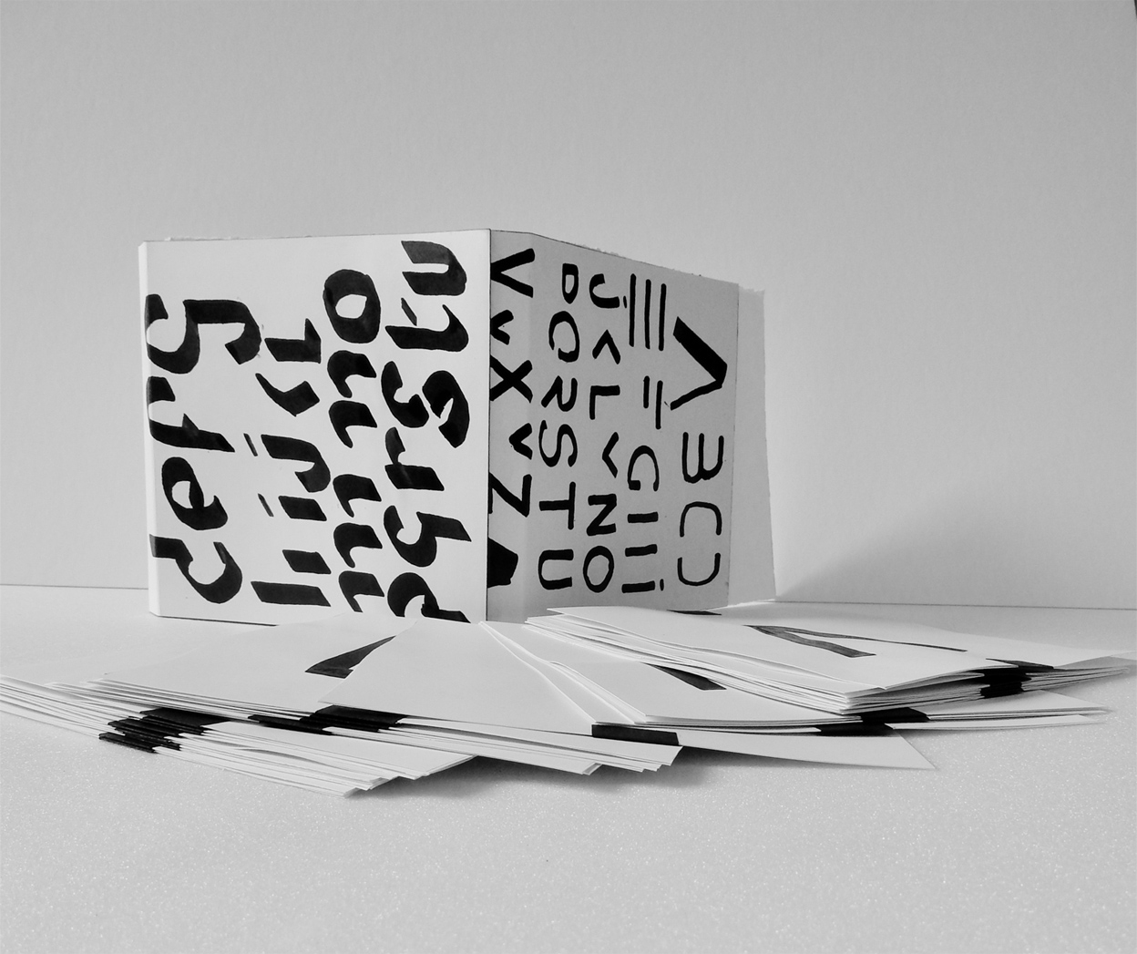 J’ai souhaité réaliser une typographie au calame en mettant en avant un concept de cartes facilement consultables. De plus, ces cartes sont glissées dans un feuillet en papier végétal. La partie titre ainsi que le nom ont été réalisées avec des caractères en plomb.