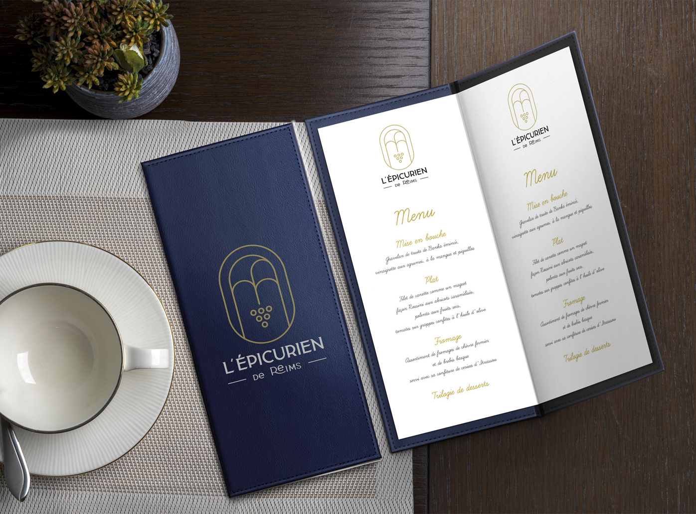 Lors d’un projet scolaire, le but était de réaliser l’identité visuelle du restaurant « L’Épicurien de Reims ». Le but était d’y implémenter différentes valeurs telles que le luxe et le raffinement.